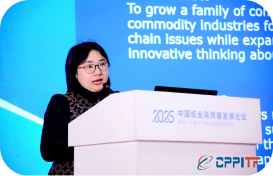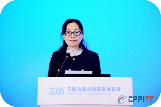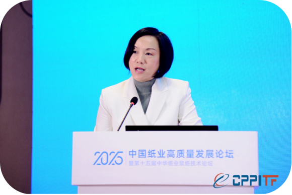 玖龙纸业(重庆)有限公司高级经理杨月霜女士代表联合主办单位致辞。杨月霜向大会的顺利召开表示最衷心的祝贺,向长期以来关心和支持玖龙纸业发展的各级领导、行业协会、科研院校、合作伙伴以及媒体朋友们致以最诚挚的感谢。她表示,玖龙纸业愿与在座的各位同仁一道携手推动造纸工业向绿色化、智能化、高端化迈进,共同书写中国从造纸大国迈向造纸强国的新篇章。