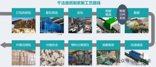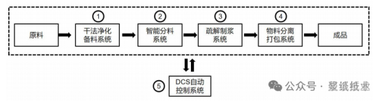 杰锋机械技术负责人张鹏向我们展示了整个工艺的核心流程。与外界误解的“干磨浆”不同,该技术通过五大系统协同作业,实现了废纸到洁净再生纤维的全程物理转化: