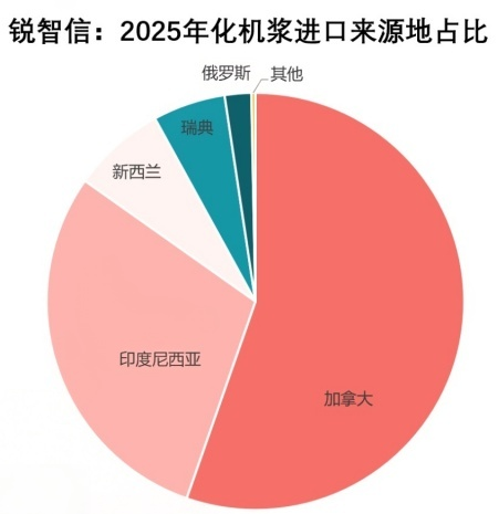 2025年化机浆进口量略低于五年均值。进口化机浆来源地高度集中,加拿大货源占据全年化机浆进口总量五成以上。不同于2024年零进口,2025年印度尼西亚进口货源占比高达29.46%,跃居化机浆进口来源国第二位,这或许与跨国企业资源调配比重提升密切相关。