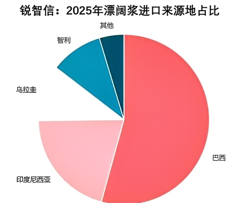 2025年漂阔浆进口量较五年均值高出14.06%。从进口来源地看,进口量最多的分别是巴西、乌拉圭和智利,三者进口量合计占比超过全年漂阔浆进口总量的7成。