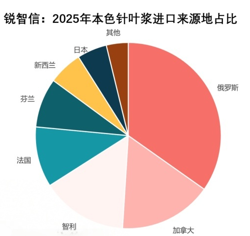 2025年本色针叶浆进口量低于五年均值。进口来源主要以俄罗斯、加拿大、智利、法国为主。