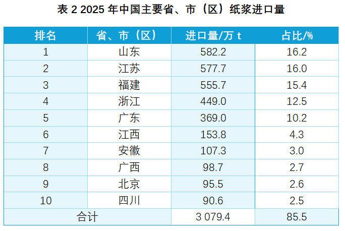 国内纸浆的进口需求与造纸产业的地理分布完全匹配。纸浆进口量前五的省份全部位于东部沿海,均为传统的造纸大省,合计进口量占比高达72.3%。其中,山东、江苏、福建三省位列前三,纸浆进口量均超过550万t,三省合计占比即接近50%。这直观反映了这些地区庞大的造纸产能对海外木浆的持续依赖。值得注意的是,广西作为近年来新建浆纸项目集中的地区,纸浆进口量已接近百万吨,表明其产能正处于爬坡和原料储备阶段。