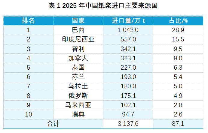 我国纸浆进口对少数几个林木资源丰富的国家依赖度高。巴西是最大的纸浆供应国,进口量超过1043万t(见表1),占总量的近29%。印度尼西亚位居第二,纸浆供应量约557万t,占比15.5%。仅巴西和印度尼西亚两国,就贡献了中国近45%的纸浆进口量。前五大来源国(巴西、印度尼西亚、智利、加拿大、泰国)的合计份额超过70%。这种高度集中的供应结构,意味着中国的造纸原料供应链容易受到主要出口国政策变动、自然灾害或国际物流波动的直接影响。