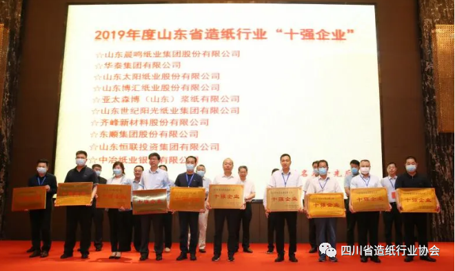 山东晨鸣纸业集团股份有限公司、华泰集团有限公司、山东太阳纸业股份有限公司、山东博汇纸业股份有限公司、亚太森博(山东)浆纸有限公司、山东世纪阳光纸业集团有限公司、奇峰新材料股份有限公司、东顺集团股份有限公司、山东恒联投资有限公司、中冶纸业银河有限公司以上十家企业荣获2019年度山东省造纸行业“十强企业”。