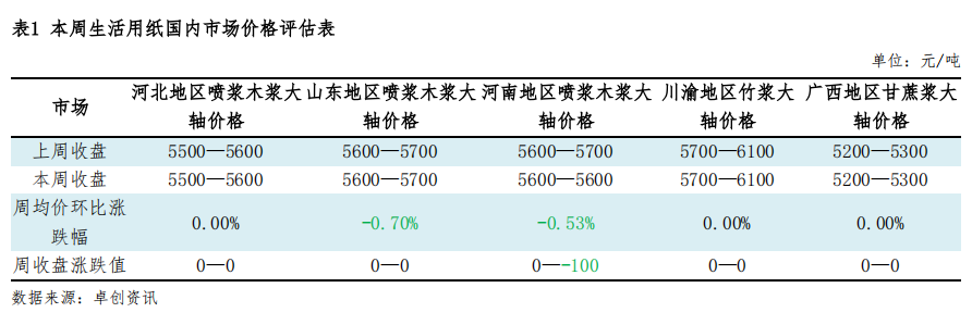 本周生活用纸市场底部偏弱运行。据卓创资讯数据监测显示,本周生活用纸均价5588元/吨,较上周下跌0.18%,跌幅扩大0.14个百分点。木浆生活用纸均价5604元/吨,较上周下跌0.46%,跌幅扩大0.41个百分点。影响价格变化的因素如下:第一,近期上游纸浆价格小幅上涨整理,成本面底部支撑力度增强,部分厂家认为目前市场底部已现,后期存探涨趋势,但因近期成品动销节奏偏缓,市场缺乏利好刺激,局部高价仍有松动;第二,下游加工厂囤货意愿依旧较低,继续谨慎观望纸浆价格变化,且对后市信心仍显不足,导致生产企业库存向下转移难度仍存。