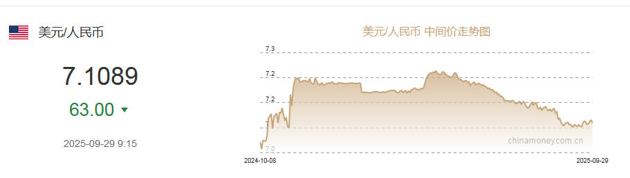 9月29日,人民币对美元中间价报7.1089元,上调63个基点。