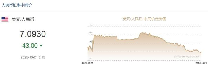 10月21,日人民币对美元中间价报7.0930元,上调43个基点。