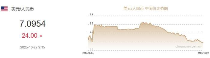 10月22日,人民币对美元中间价报7.0954元,下调24个基点。