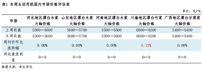 上周生活用纸市场价格平稳运行,场内整体交投氛围清淡市场情绪趋于谨慎状态。原料纸浆市场价格区间整理为主市场实际成交状况一般,生活用纸成本面支撑作用不足;生活用纸终端下游需求未见明显起色,部分纸企出货速度放缓行业整体开工率维持较低水平。综合来看,当前供需博下预计短线内生活用纸市场价格或区间盘整,重点关注原料浆价的变动及需求端订单释放节奏变化。