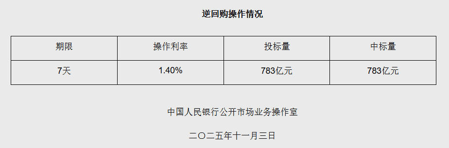 据央行网站消息,2025年11月3日中国人民银行以固定利率、数量招标方式开展了783亿元7天期逆回购操作。