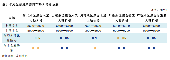 针叶浆:布针报收4900元/吨,乌针报收5350元/吨,月亮报收5430-5450元/吨,太平洋报收5450-5480元/吨,雄狮、马牌报收5550-5570元/吨,银星报收5550-5580元/吨,凯利普报收5620-5630元/吨,北木报收5900元/吨,南方松报收5950-6500元/吨,金狮报收6200元/吨。