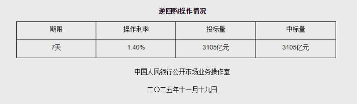 据央行网站消息,2025年11月19日中国人民银行以固定利率、数量招标方式开展了3105亿元7天期逆回购操作。