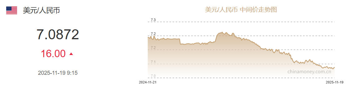 11月19日,人民币对美元中间价报7.0872元,下调16个基点。