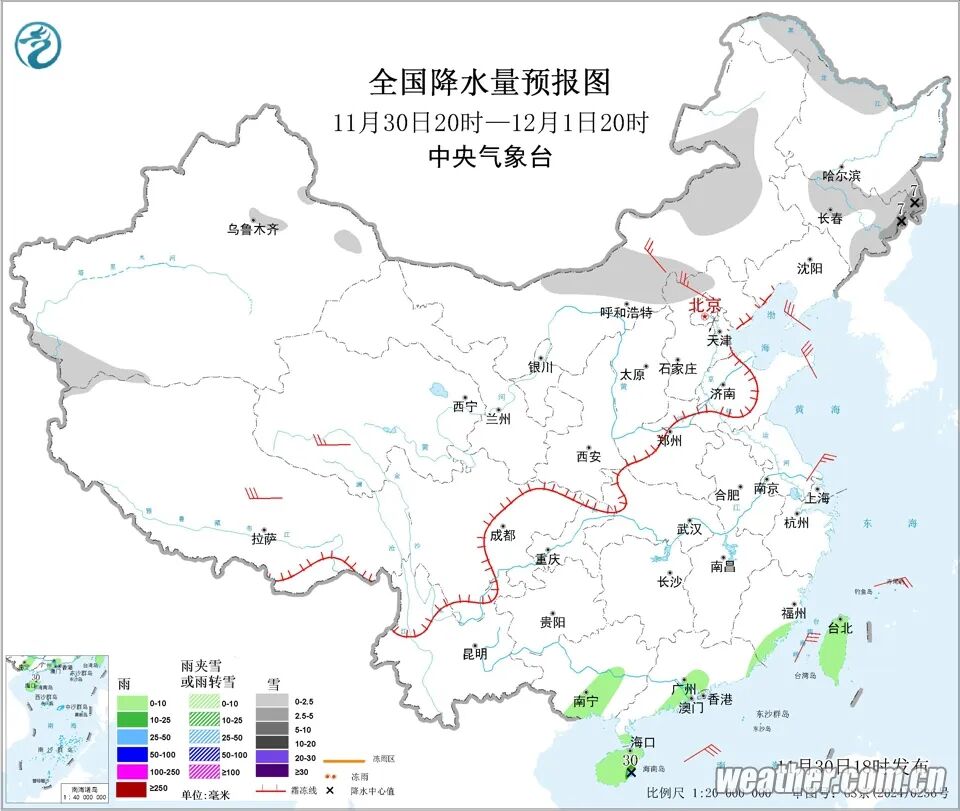 12月1日,受寒潮影响,我国北方将迎明显降温,东北等地局地降幅可超10℃,体验隔天换季,公众需加强保暖措施。今天,内蒙古、黑龙江北部和南部、吉林北部、新疆沿天山地区及南疆盆地西部山区、甘肃河西、河北北部等地部分地区有小到中雪或雨夹雪。四川东南部、重庆西部、贵州西北部、安徽中部、海南岛、台湾岛等地部分地区有小到中雨。