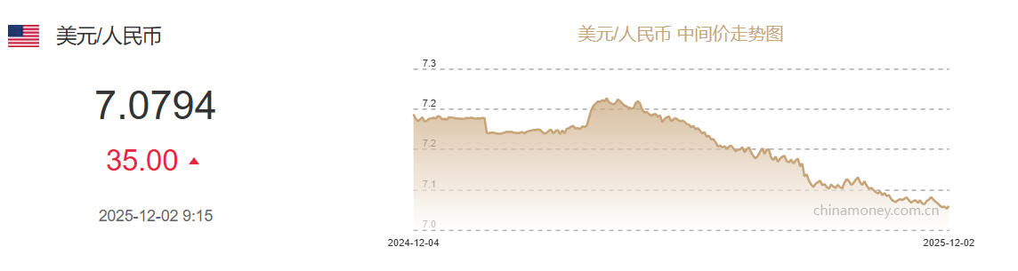 12月2日,人民币对美元中间价报7.0794元,下调35个基点。