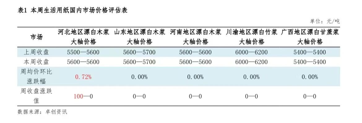 上周生活用纸市场价格区间震荡,场内整体交投活跃度变化不大,市场观望情绪较浓。原料纸浆市场震荡调整运行周内针叶浆、阔叶浆价格持续上涨,对生活用纸纸价支撑作用较强:生活用纸终端下游采购积极性一般,保持刚需采买,部分纸企订单情况未见明显起色,出货状况一般行业整体开工率变化不大。综合来看,当前供需博弈下,预计短线内生活用纸市场价格或将区间整理为主重点关注原料浆价的变动及下游需求复苏动向。