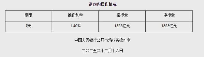据央行网站消息,2025年12月16日中国人民银行以固定利率、数量招标方式开展了1353亿元7天期逆回购操作。