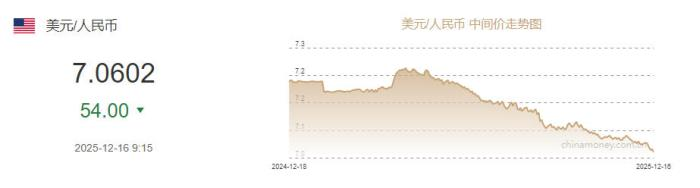 12月16日,人民币对美元中间价报7.0602元,上调54个基点。