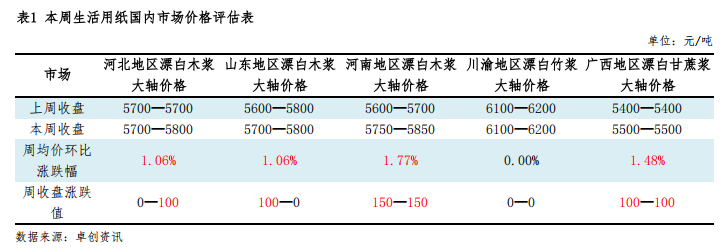 昨日生活用纸市场价格区间整理为主,场内整体交投氛围变动不大,市场观望情绪较浓。原料纸浆市场价格以稳为主,阔叶浆价格依旧坚挺,生活用纸成本面支撑作用略强;生活用纸终端下游需求改善不大,刚需采购为主,部分纸企面临出货压力,去库存进程有所放缓。综合来看,当前供需博弈下,预计短线内生活用纸市场价格或将区间盘整,重点关注原料浆价的变动及主力纸企装置运行情况。