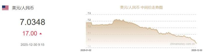 12月30日,人民币对美元中间价报7.0348,下调17个基点。