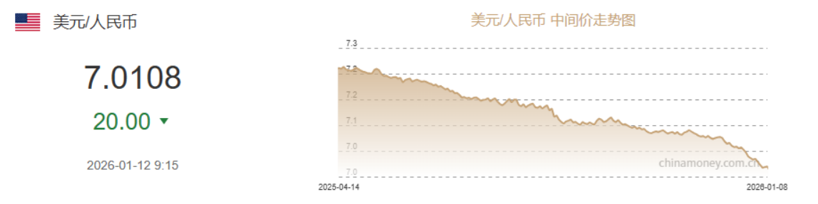 1月12日,人民币对美元中间价报7.0108元,上调20个基点。