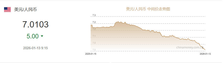 1月13日,人民币对美元中间价报7.0103元,上调5个基点。
