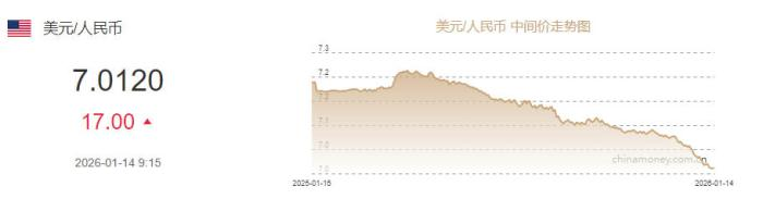 1月14日,人民币对美元中间价报7.0120元,下调17个基点。