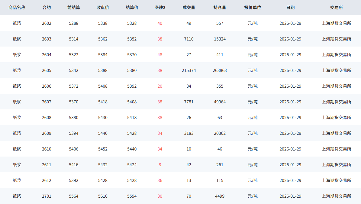 数据显示,截至1月29日,本周进口针叶浆周均价5358元/吨,较上周下跌0.43%,跌幅较上期收窄2.65个百分点;进口阔叶浆周均价4593元/吨,较上周下跌0.93%,跌幅较上期收窄0.07个百分点;进口本色浆周均价4975元/吨,较上周下跌0.28%,跌幅较上期收窄1.06个百分点;进口化机浆周均价3892元/吨,较上周持平,由跌转稳。