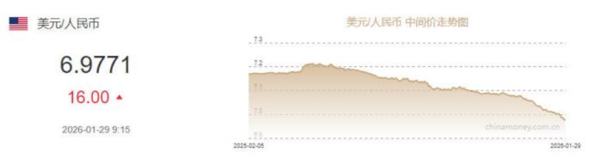1月29日,人民币对美元中间价报6.9771,下调16个基点。
