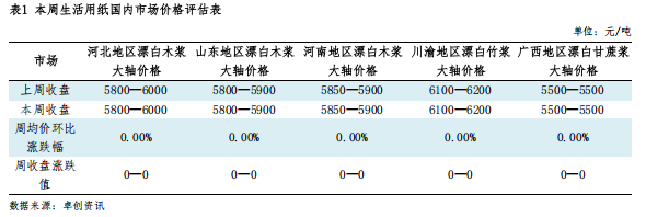 针叶浆及进口阔叶浆现货市场价格延续偏稳运行;进口本色浆以及进口化机浆市场横盘运行为主,市场活跃度持续偏低。