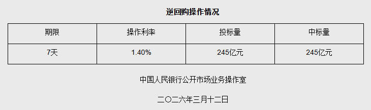 据央行网站消息,2026年3月12日中国人民银行以固定利率、数量招标方式开展了245亿元7天期逆回购操作。