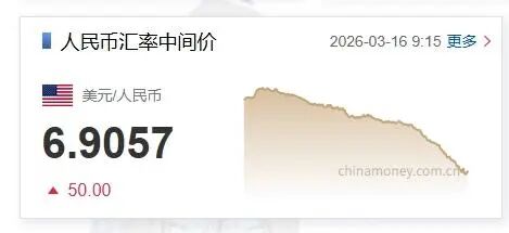 3月16日,人民币兑美元中间价报6.9057,调降50个基点。