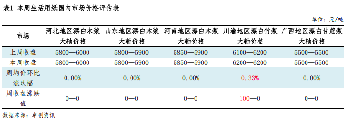 昨日生活用纸市场价格区间整理为主,市场整体交投活跃度变化不大,主力纸企消息面较为安静。原料纸浆市场震荡调整运行,针叶浆、阔叶浆价格小涨,生活用纸成本面支撑作用不足;生活用纸终端下游需求不温不火,保持按需入市采买,主力纸企维持正常走货,部分中小型纸企出货表现欠佳。综合来看,当前供需博弈下,隆众资讯预计短线内生活用纸市场价格或将以稳为主,重点关注原料浆价的变动及下游需求复苏动向。