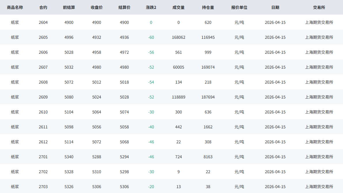 期货市场:SP主力05合约低位反弹,报收4980点,较昨日结算价反弹44元/吨。