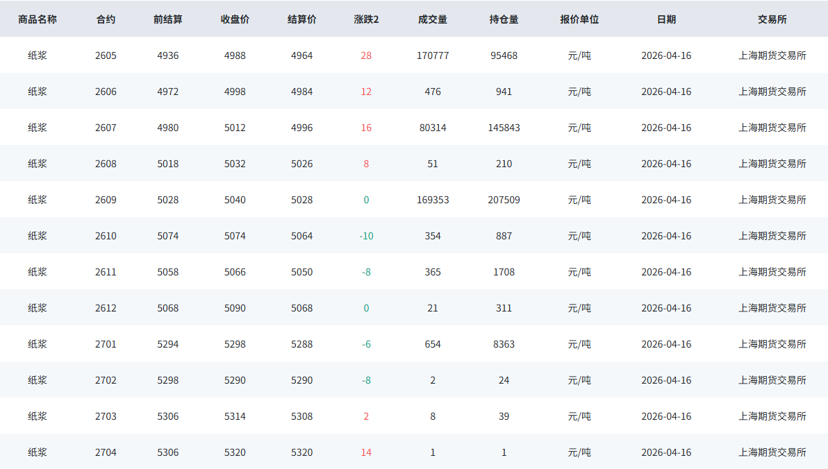 期货市场:SP主力05合约低位反弹,报收5028点,较昨日结算价反弹64元/吨。