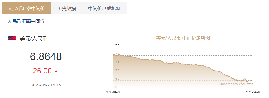 4月20日,人民币对美元中间价报6.8648,下调26个基点。