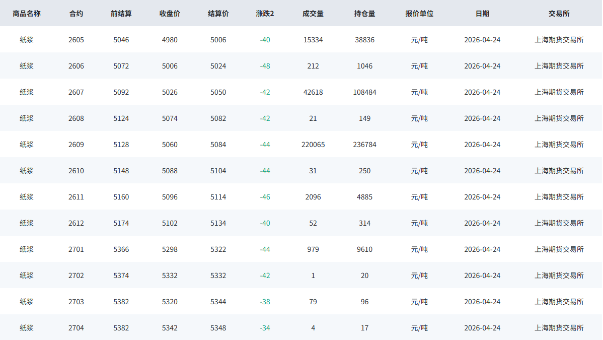 期货市场:SP主力09合约小幅走弱,报收5062点,较昨日结算价跌22元/吨。
