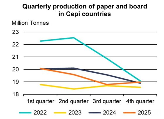 根据2025年前九个月的数据推算,欧洲造纸工业联合会成员国纸张与纸板的表观消费总量同比下降了2.2%。这主要受到印刷用纸需求持续下滑(-7.9%)以及生活用纸市场需求疲软(-1.9%)的双重拖累。