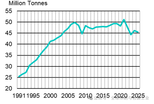 若剔除印刷用纸,仅考察包装纸及纸板、生活用纸以及其他特种纸的产出,欧洲2025年的产量表现相对稳健,但与2021年的历史巅峰相比,仍存在6.8%的差距。