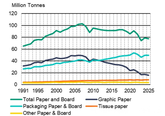 2023年的大幅减产主要归因于不利的宏观经济趋势、贯穿全年的供应链去库存行为,以及能源与制造成本高企对工业造成的沉重打击。此外,欧洲日益沉重的监管负担、地缘政治挑战以及贸易紧张局势的加剧,进一步恶化了产业环境。到2025年,全行业总产量定格在7760万吨,多数纸张与纸板品种的产量均有所收缩。