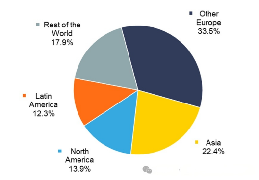 在出口地域分布上,除拉丁美洲外,欧洲对全球几乎所有地区的出口额均有所收缩:对欧洲邻国出口下降5.5%,对北美下降2.7%,对亚洲大幅下降15.0%,对世界其他地区微降0.4%。对拉丁美洲的出口成为了唯一亮点,同比增长17.4%。