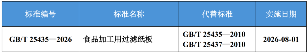 近日,国家市场监督管理总局(国家标准化管理委员会)发布2026年第4号公告,批准发布《热交换器》等354项推荐性国家标准和7项推荐性国家标准修改单,其中包括造纸领域国家标准《食品加工用过滤纸板》,具体信息如下。